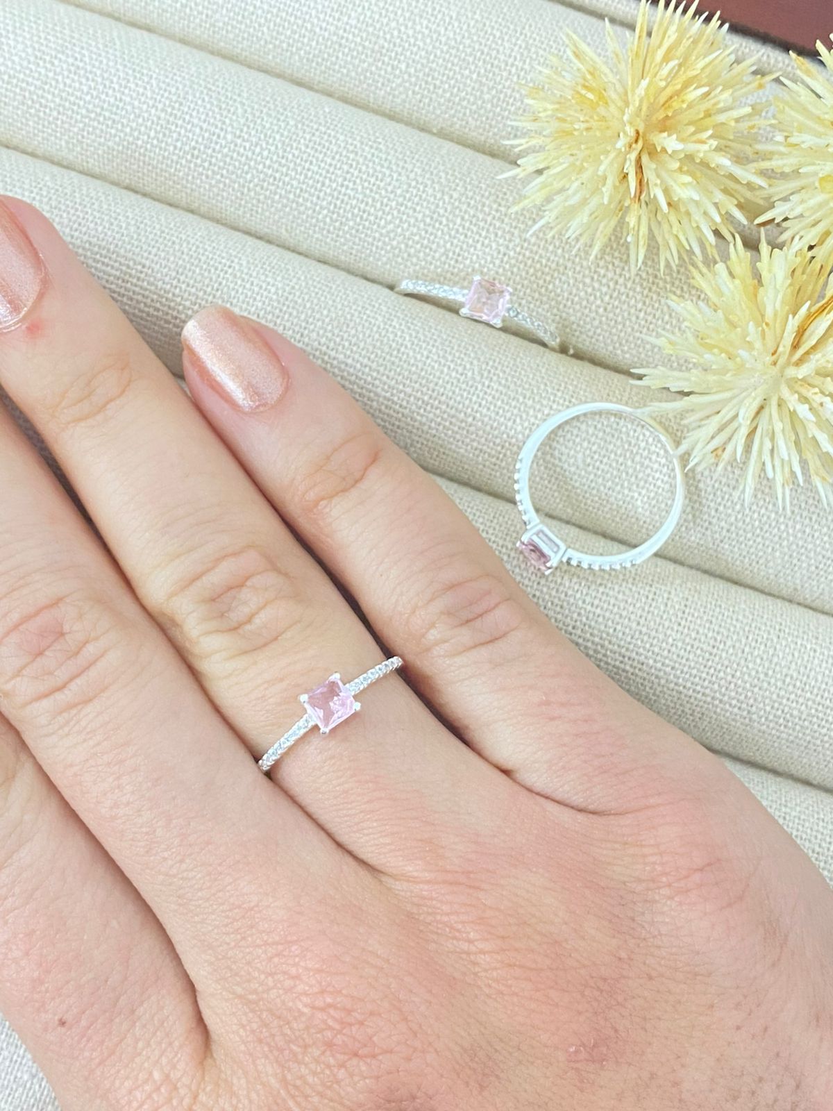 P1-18 Anel QUADRADO CRAVEJADO ROSA ANI1357 1g LOTE 19